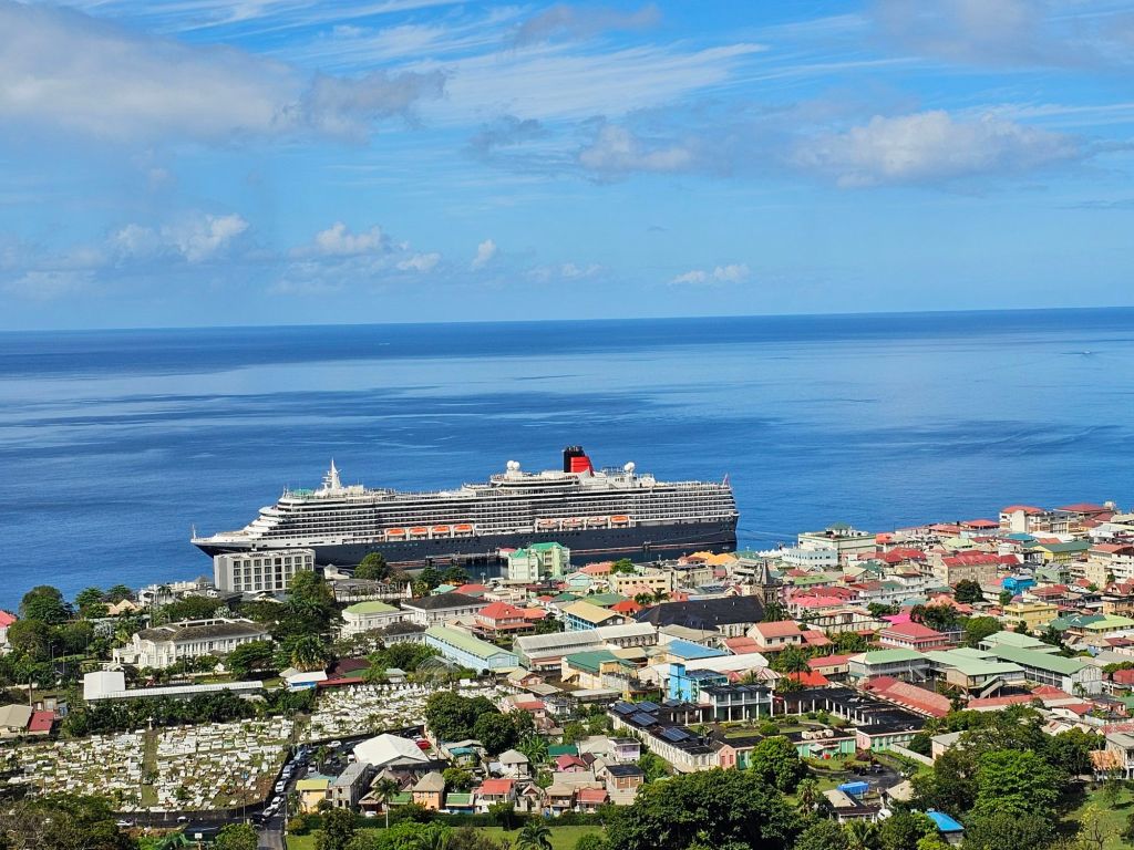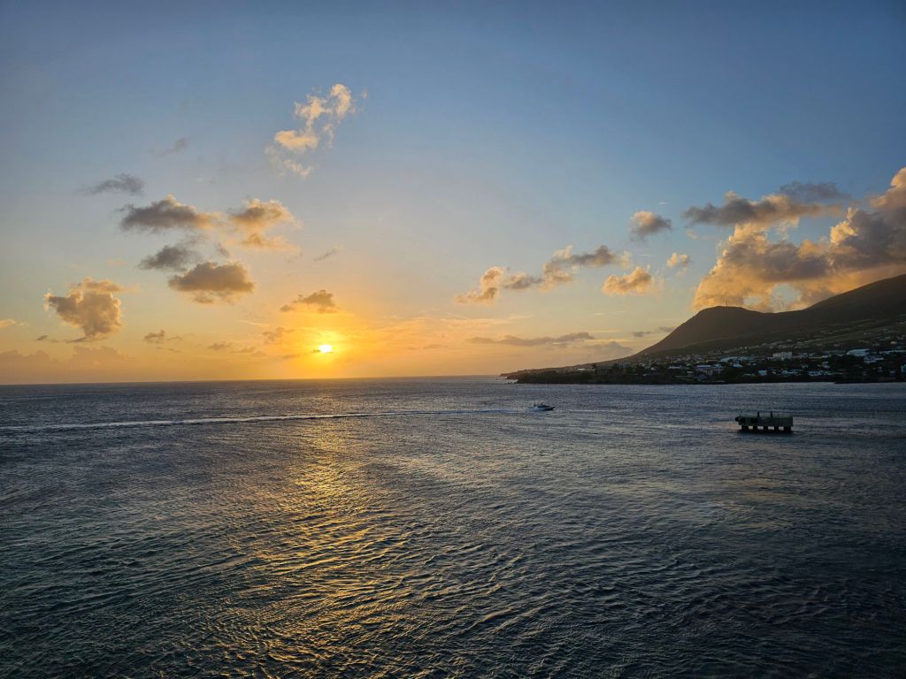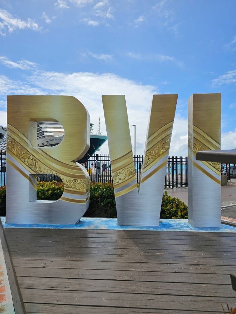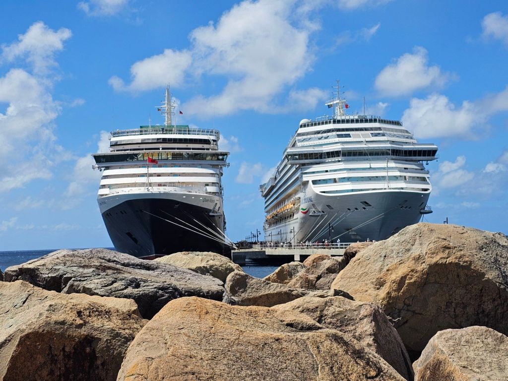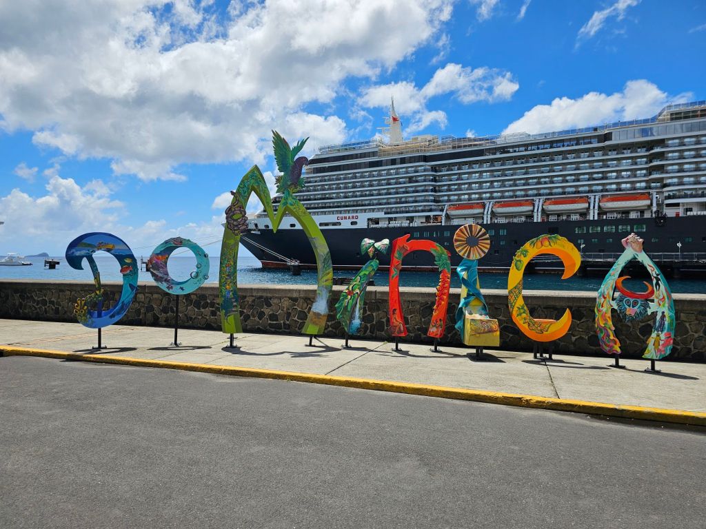 Da ich einen früh startenden Ausflug – gebucht über Cunard – mit dem schönen Titel „Easy St.Kitts“ hatte, war ich eine der ersten, die nach einem frühen Kabinenfrühstück das Schiff verlassen habe und kam auf einen noch ruhigen Pier. St. Kitts und Nevis https://de.wikipedia.org/wiki/St._Kitts_und_Nevis ist eines der Länder, in denen König Charles III. noch Staatsoberhaupt des kleinen seit 1983 unabhängigen Staates mit etwas über 51.000 Einwohner*innen auf den beiden zur Föderation gehörenden Inseln ist. Im Oktober 2025 hat das Land auch ein eigenes ETA, das rund 20 $ kostet, eingeführt, hat aber für Kreuzfahrttagesgäste Sonderregelungen: diese müssen neben der Schiffskarte auch einen amtlichen Lichtbildausweis (mein Personalausweis war ausreichend) vorlegen.