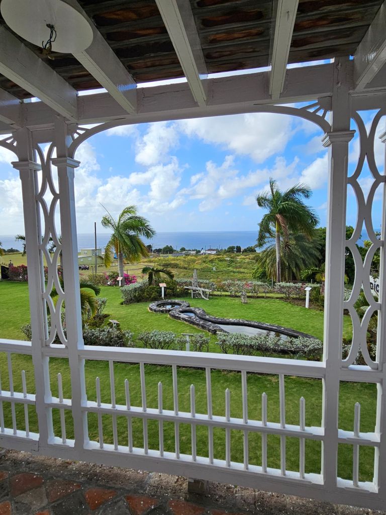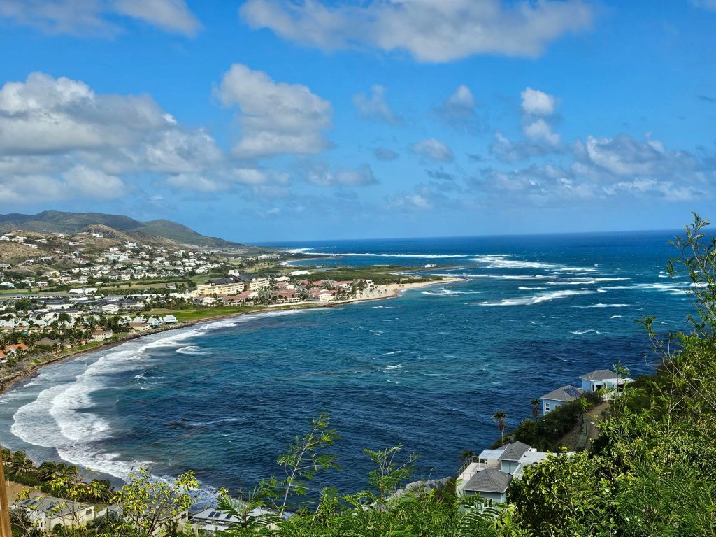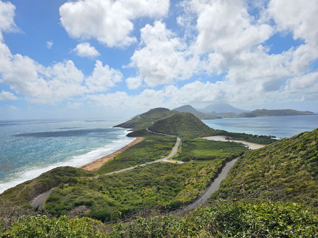 Der zweite Stop dieses Ausflugs war am Aussichtspunkt Timothy Hill. Hier hat man nicht nur einen guten Ausblick auf die andere Insel der Förderation, Nevis, sondern hier ist die Insel so schmal, dass man gleichzeitig den Atlantik und die karibische See in ihrer Unterschiedlichkeit sieht.