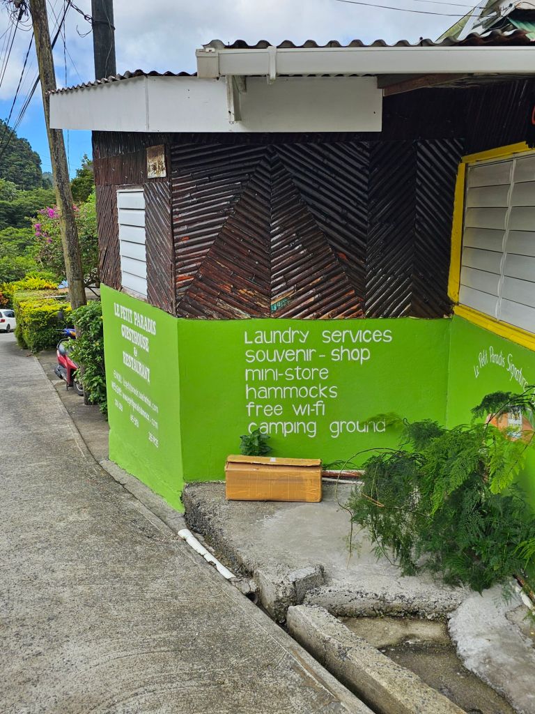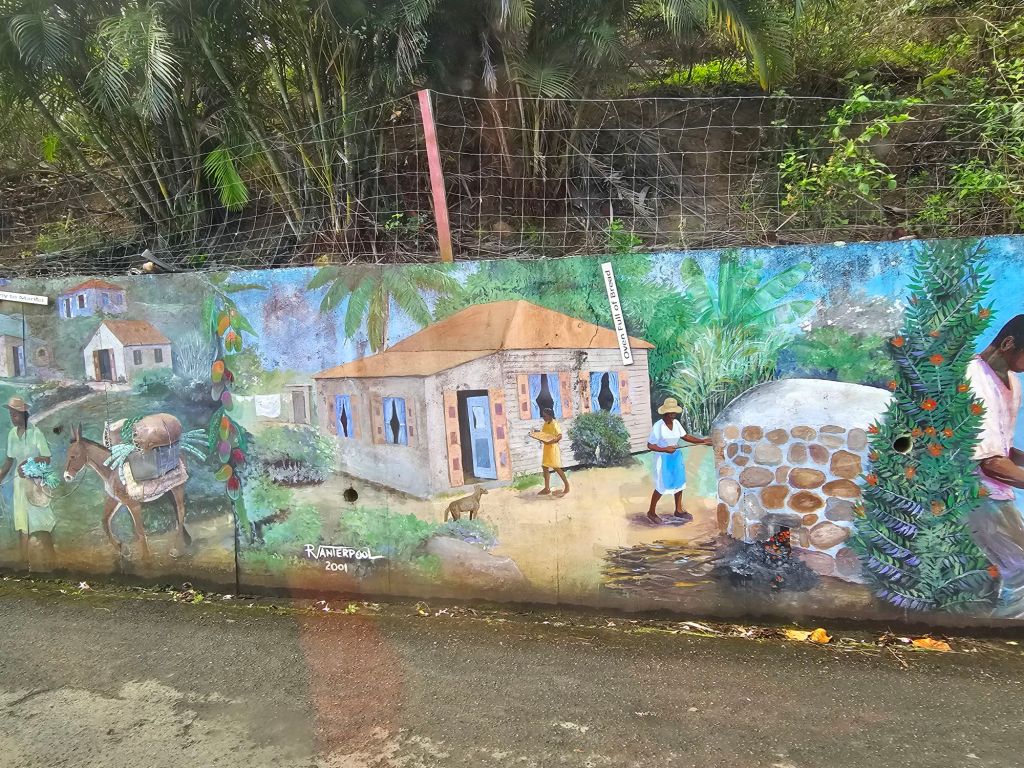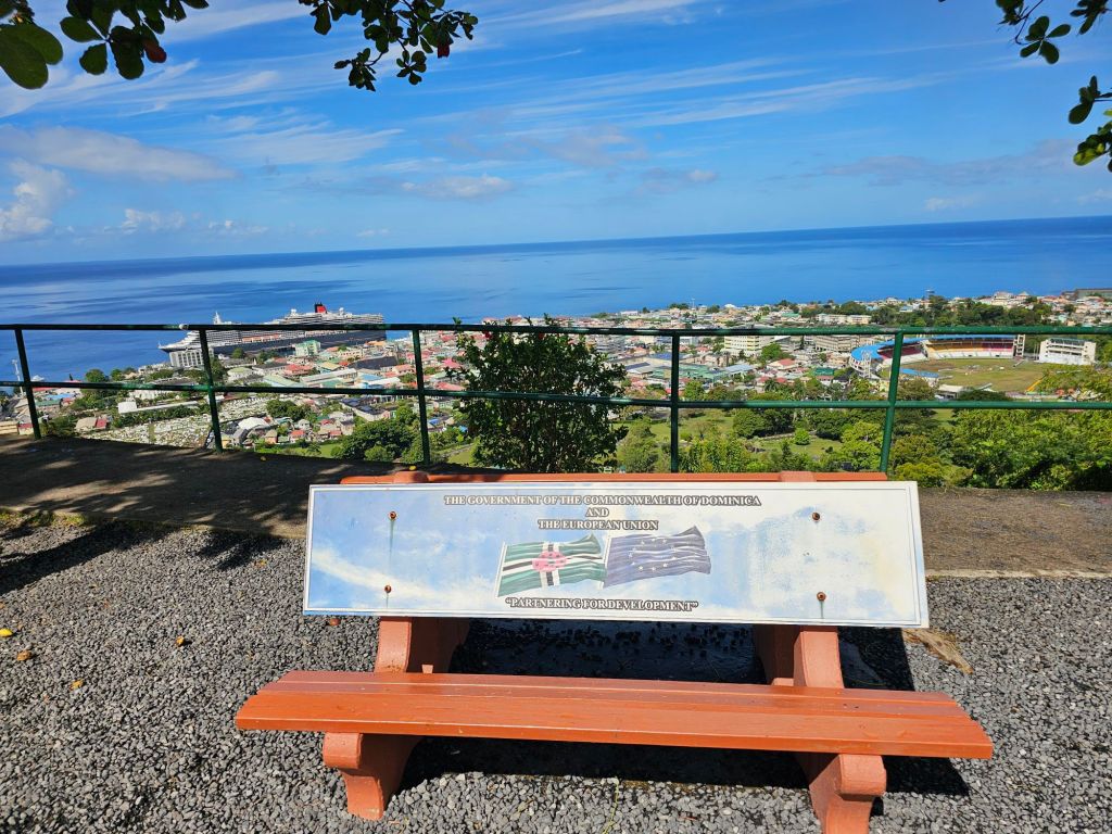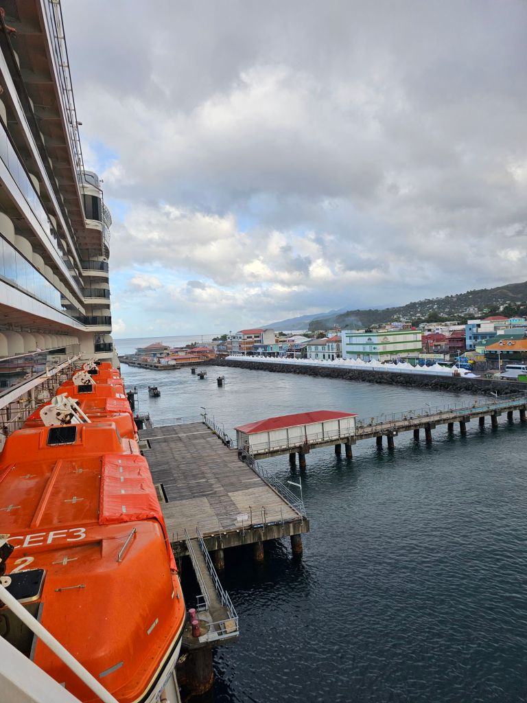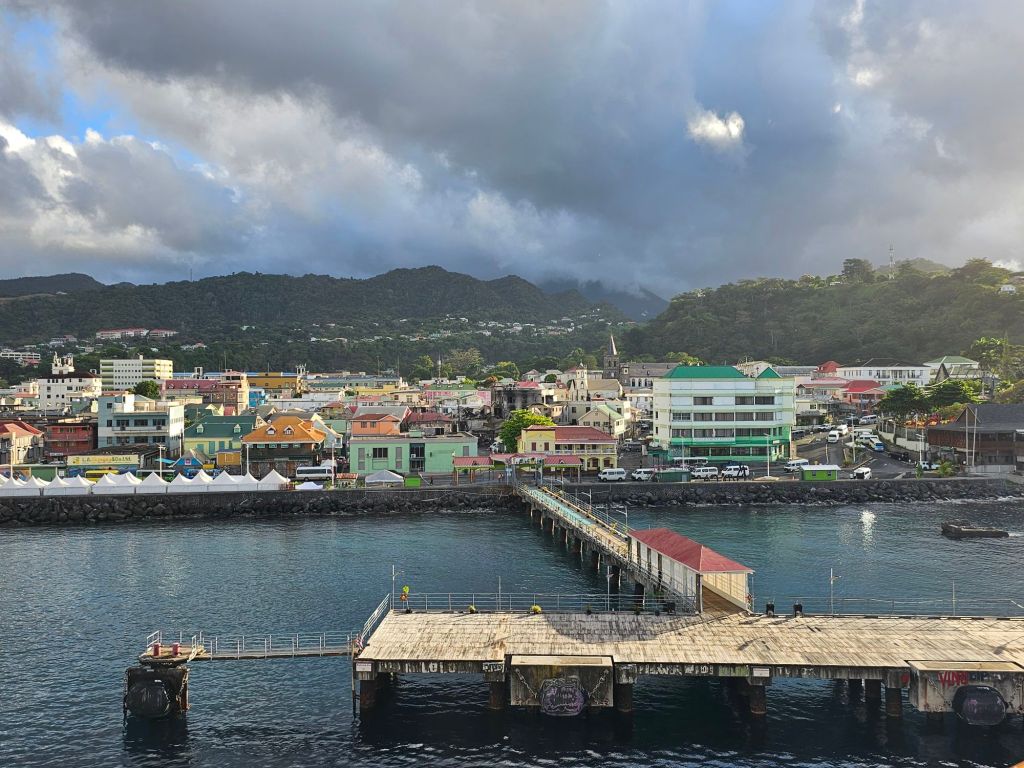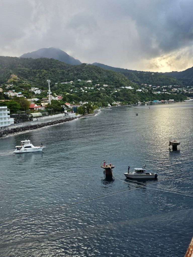 In Domenica ist Landwirtschaft der grösste Wirtschaftsbereich. Tourismus folgt erst – anders als auf den meisten anderen karibischen Inseln – auf dem 2.Platz. Vielleicht deshalb wirkt alles etwas provisorisch. Es gibt kein Terminalgebäude mit Dutyfree-Geschäften, Bus- und Taxiparkplätzen und öffentlichem WLAN. Der Anleger selbst ist im Vergleich zu den anderen Häfen, die wir angelaufen sind, weniger gut ausgebaut. Deshalb wird das Schiff an Pollern im Wasser festgemacht, weil der Pier nur sehr kurz ist.