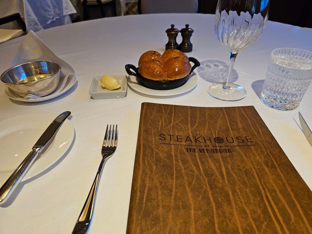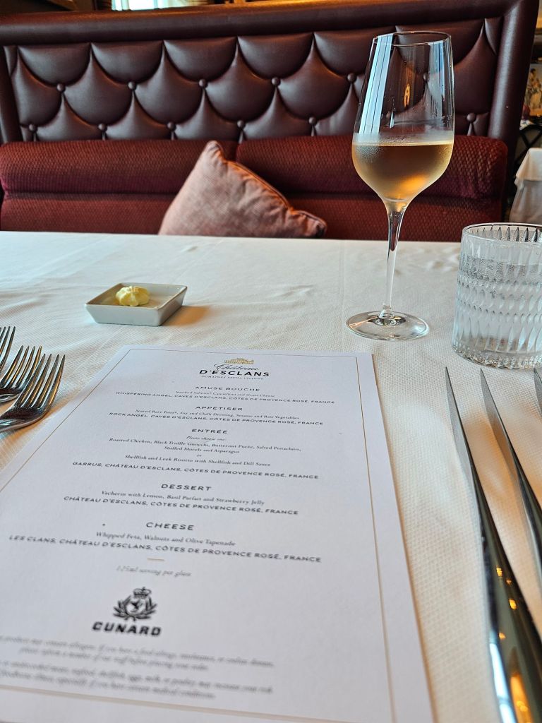 Und auch mein Kabinensteward Hernando und mein Dinner-Kellner Gilbert waren beide zauberhaft. Und es war schön, beim Lunch einen Weinkellner einer früheren Reise, Dane, wieder zu sehen und ihm persönlich zu sagen, dass seine damalige Beratung immer noch meine Reisen mit Cunard begleitet, zum einen durch seine Empfehlung meines Immer-Noch-Lieblingsrotwein zum Dinner, zum anderen durch seine Empfehlung, doch zum Lunch&Learn zu gehen, was ich mittlerweile ziemlich gerne mache.