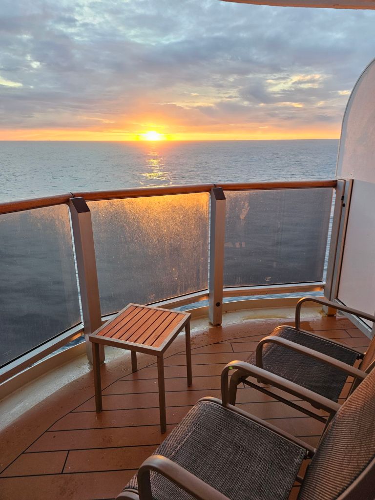 Meine Kabine für diese Reise ist die Balkonkabine 5054. Ich habe so früh gebucht, dass diese Kabine aufgrund ihrer Lage „an der Ecke“ mit mehr Platz in der Kabine und dem Balkon noch verfügbar war. Mehr Platz ist immer gut und auch die Lage – nahe beim Treppenhaus A, aber auch nicht weit zum Treppenhaus B – auf Deck 5 bedeutet kurze Wege zu den meisten Orten auf dem Schiff. Und man kommt auch ohne auf den Fahrstuhl warten zu müssen ohne Probleme voran und hat gleich mit dem Treppensteigen gute tagesintegrierte Bewegung. Allerdings ist der Balkon bei entsprechenden Winden auch ein Ort, wo sich fliegendes Material am Boden sammelt, von Farbsplittern nach Instandhaltungsarbeiten bis zu Taschentüchern.