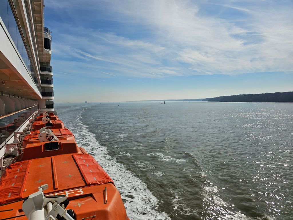 Gegen 11 Uhr hatten wir den Tejo wieder verlassen und nahmen wieder Kurs auf Southampton, das wir trotz Höchstgeschwindigkeit später als geplant am Sonntag erreichen würden. Deshalb hatten alle Bereiche an Bord viel zusätzliche Arbeit, um die Folgen der späteren Ankunft organisatorisch in den Griff zu bekommen. Freitag Abend hatten alle Passagiere eine schriftliche Info zur Ausschiffung – nun am Sonntag Mittag statt Morgen – in der Kabine und ihre entsprechenden Koffertags. Ich erhielt zudem die Info, dass mein (über Cunard gebuchter) direkter British Airways Flug nach Berlin auf einen Flug eine Stunde später mit der Lufthansa umgebucht wurde.