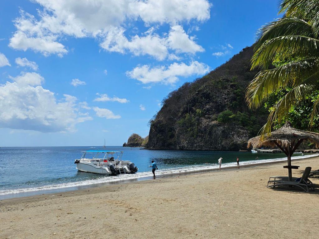 Weiter ging es zu einer kurzen Pause mit einem Sandwich und Getränken am Strand des Soufriere Beach Park am Hummingbirdstrand mit Blick auf die Pitons.