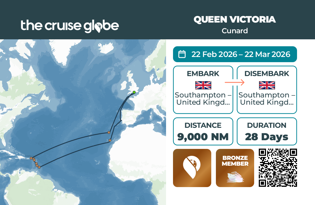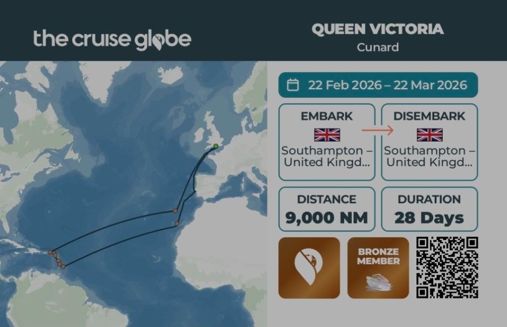 Diese Reise war von der Idee geleitet, die Karibik ohne Jetlag und deshalb mit vielen Seetagen auf dem Weg dorthin und zurück zu erleben – also eher eine Reise vor allem um der Reise selbst statt nur des Zieles willen. Es ist mit 28 Tagen meine bisher längste Reise und erfordert deshalb einiges an Gepäck. Das ist bei einem Start bzw. Ende der Reise in Southampton mit dem damit verbundenen Flug zwischen Heathrow und dem BER mit einer Gepäckbeschränkung auf 23 kg eine echte Herausforderung beim Packen. Aber deshalb auf viele stilvolle Cunard-Seetage verzichten und die Route mit Mein Schiff ab/bis Bremerhaven machen, zumal wenn es eine solche Gelegenheit auf der Queen Victoria gibt? Solche Gelegenheiten nutze ich zu gerne für echtes Cunard-Feeling.